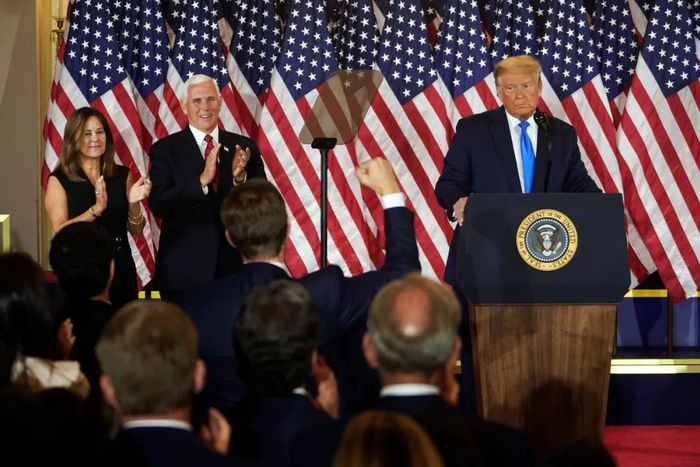 周二,特朗普在位于弗吉尼亚州艾灵顿的选举指挥中心发表演说。©Anna Moneymaker
