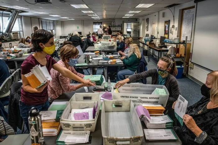 周一,密歇根州兰辛市的民调人员正在为已经邮寄过来的选票做准备工作。密歇根州在选举日之前已经开始合法计票。©Bryan Denton