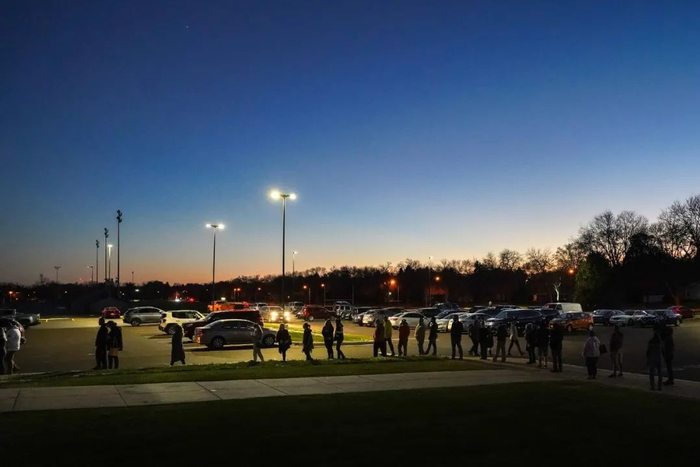 在乔治亚州诺克罗斯的一群选民。该州计票结果被推迟,因为在亚特兰大,计算缺席选票的地方水管破裂。© Audra Melton