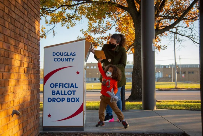 周一在内布拉斯加州的奥马哈市,Golda Vitamvas和她的儿子Granville选择了缺席选票进行投票。©Calla Kessler
