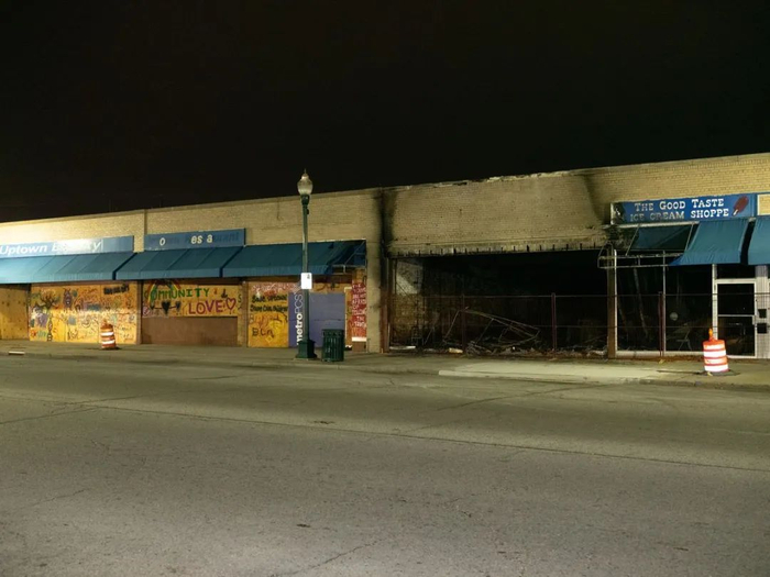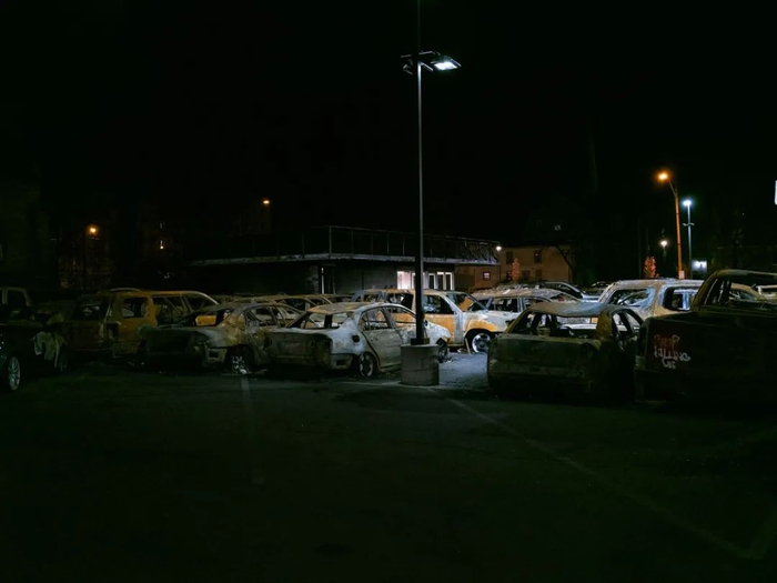 威斯康星州基诺沙地区。焦烧的汽车残骸仍停在停车场。特朗普在该地发表了关于社区安全的言论,称为“依法治国的总统”。© Peter van Agtmael