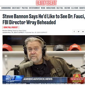 而在一档他自己的网络广播节目中,班农则在“畅想”特朗普当选后的4年将如何展开时表示,他认为特朗普不仅应该开除一直在恳切呼吁特朗普认真防疫的美国资深传染病学专家福奇等人,还应该效仿英国在16世纪时惩处罪犯的做法,将福奇这种人“砍头斩首”并“插在长矛上”,以警示其他特朗普政府的官员,让他们不要对特朗普和他的事业“不忠”。