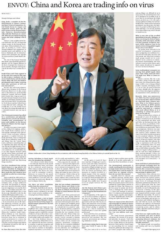 中国驻韩国大使馆网站11月6日消息,11月4日,邢海明大使接受韩国《中央日报》英文版《JoongAng Daily》专访,祝贺其创刊20周年。邢海明表示,中韩两国在管控疫情、重启合作方面走在前列,显示出中韩合作的韧性和巨大潜力。中韩两国在人力、资金、技术等方面优势互补,存在巨大的合作空间。希望《JoongAng Daily》继续坚持公正报道方针,客观报道中国发展现状,为增进两国互信理解发挥积极作用。