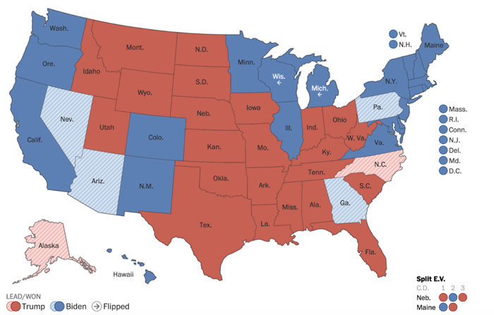 但是,随着关键摇摆州宾夕法尼亚州、佐治亚州纷纷“翻蓝”,局势已经越来越明朗:民主党总统候选人拜登稳住253张选举人票,此外在四大关键州保持领先;共和党总统候选人特朗普保持214张选举人票,原本领先的多个关键州被翻蓝,目前关键州中仅剩北卡罗来纳州仍保持“浅红”,另有一个“话语权”相对较弱的阿拉斯加州保持“中红”。