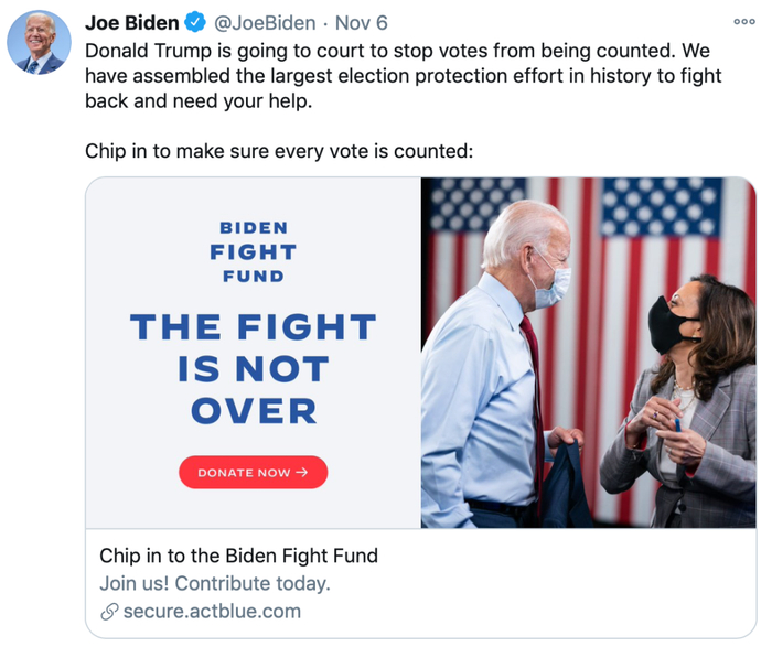拜登则自信满满。11月6日,他在推特上强调,“没有人能带走我们的民主,现在不能,以后也不能”,呼吁支持者“保持信心”。他还指出,特朗普试图通过法院挑战阻止一些选票被计入结果,“我们需要你的帮助来作出回击,做出史上最大的大选保护工作”。
