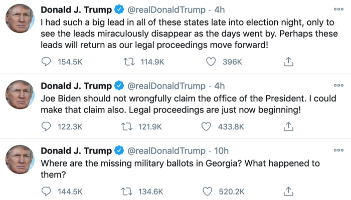 特朗普对此很不满。6日晚,他在推特上连发多条推文,称“乔·拜登不应错误地宣布胜选。我也能这么宣布。但法律程序才刚刚开始!”