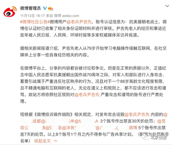 11月13日18时17分,新浪微博社区管理官微发布公告称,站方依照社区规则对严重攻击和谩骂88岁抗美援朝老战士@老兵尹吉先 的账号进行严肃处理。3个账号被作出禁言30天的处罚,5个账号被作出禁言7天的处罚,这8个账号1个月之内不得参与广告共享计划。