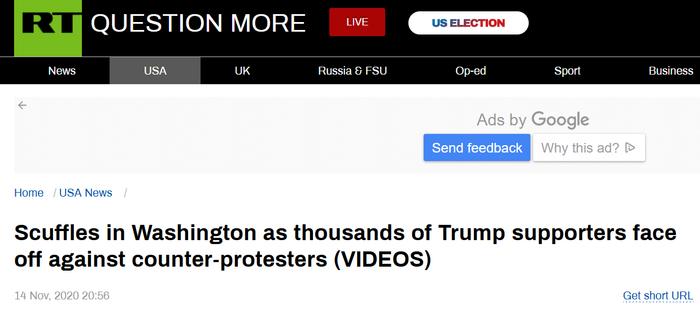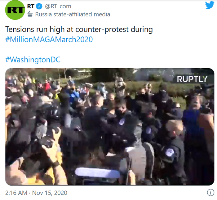 RT称,华盛顿特区的街道上挂满了美国国旗和MAGA(Make America Great Again)横幅,特朗普的支持者游行抗议拜登“胜选”,他们认为拜登的胜利具有欺骗性。报道称,现场的气氛并不都是欢快的,发生了几场斗殴事件。