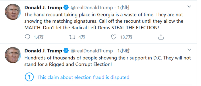 除此之外,他还发推炮轰佐治亚州的手工重新计票是在浪费时间,呼吁取消重新计票,“不要让激进的左翼民主党人窃取选举!”他还称,“他们不让我们的民调观察员进入计票室。单凭这一点我们就能赢!”