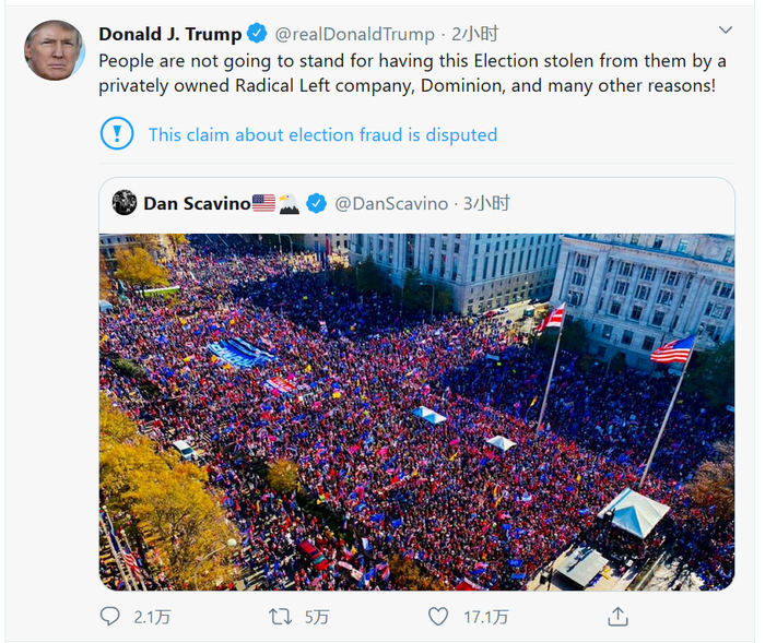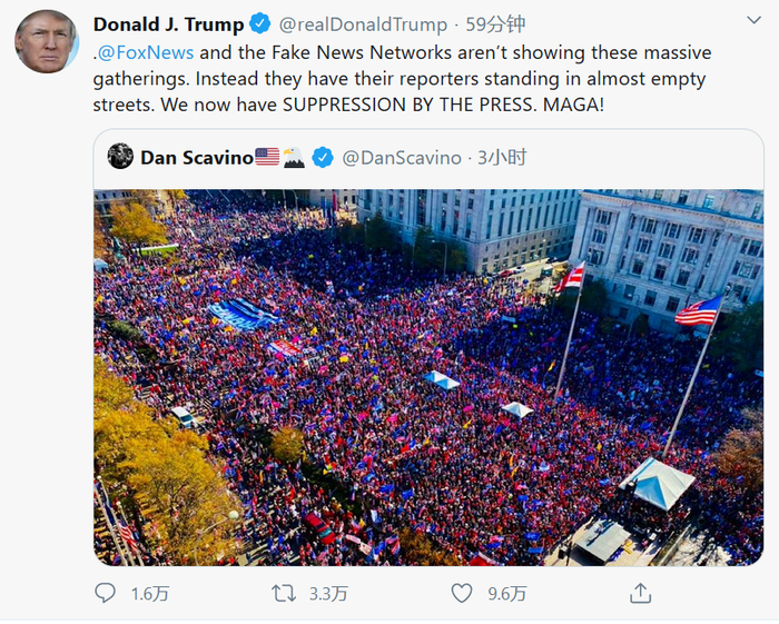 14日,特朗普在推特上大量转发现场游行现场相关图片及视频,称“人们不会容忍这次选举被一家私人激进左翼公司Dominion和许多其他原因窃取!”“我们会赢!”“成千上万的人在华盛顿表达他们的支持,他们不会支持一场被操纵和腐败的选举!”……。特朗普还痛批福克斯新闻和假新闻媒体并未报道这次集会,“相反,他们的记者却待在几乎空无一人的街上!”