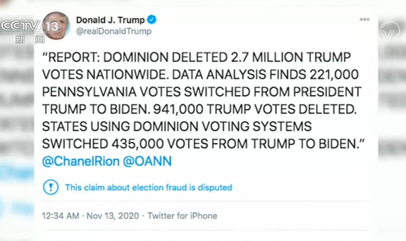 除了死者投票,特朗普团队还将矛头对准了本届大选使用的投票机。11月13日,特朗普用全大写的字母发推称:“据报道,DOMINION的投票系统在全美总共删除了270万张支持特朗普的选票。数据分析发现,221000张宾州的特朗普选票被计在了拜登名下。941000张支持特朗普的选票被删除。使用DOMINION选票设备的各州总共调包了435000张特朗普的选票。”