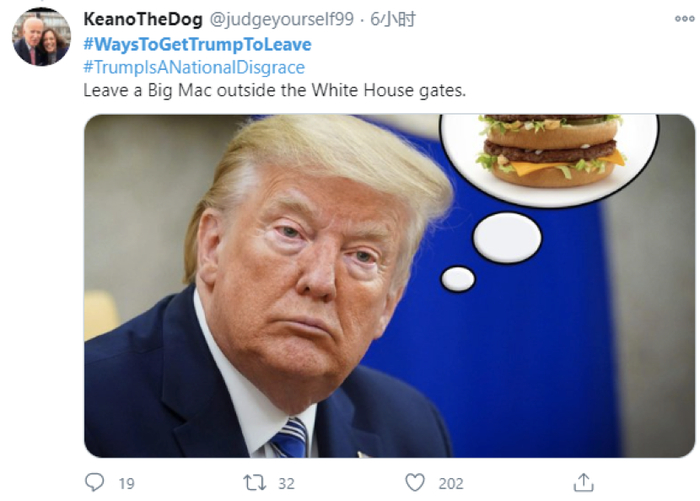 由于特朗普曾多次表示自己喜欢吃快餐,还有网友开玩笑地说:在白宫外面放一个巨无霸汉堡就行了……