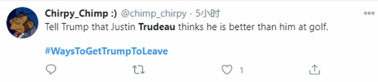 有网友还提到特朗普的“亲密盟友”——加拿大总理特鲁多。该网友写道:想让特朗普“离开”,只需要告诉他,特鲁多认为自己高尔夫打得比他更好。