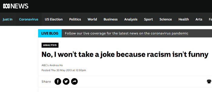 可奇怪的是,就在几年前,澳大利亚广播公司却曾刊登过一篇标题为“我就是开不起玩笑,因为种族主义并不好笑”的文章。