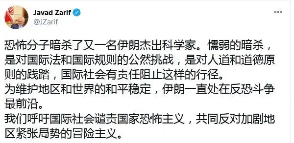 另据环球网报道,伊朗外长扎里夫在推特上用中文发推称:“恐怖分子暗杀了又一名伊朗杰出科学家。懦弱的暗杀,是对国际法和国际规则的公然挑战,是对人道和道德原则的践踏,国际社会有责任阻止这样的行径。”