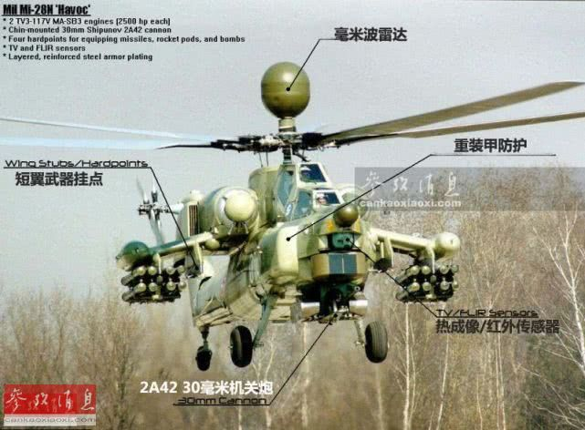 米-28N”夜间猎人“由俄米里设计局在米-28基础上改进而来,在旋翼顶部加装了毫米波雷达,大幅增强夜间作战能力,并换装了新型发动机,米-28N最大起飞重量达11.5吨,载弹量达2.4吨。