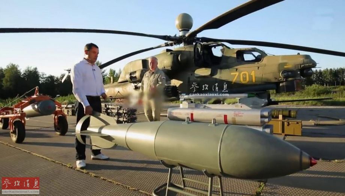 火力系统方面,米-28NM除一门30毫米2A42速射机炮(最大射速每分550发,最大射程4公里,可与BMP-2步战车通用)作为固定武器外,两侧短翼下设有4个挂点,可挂载2.3吨各型武器弹药,最多可挂载4个火箭巢(80枚S-8航空火箭弹)、4枚500公斤级航空炸弹、8枚“针”空空导弹或16枚“产品-305”新型远程反坦克导弹等。图为米-28NM地面武器展示。