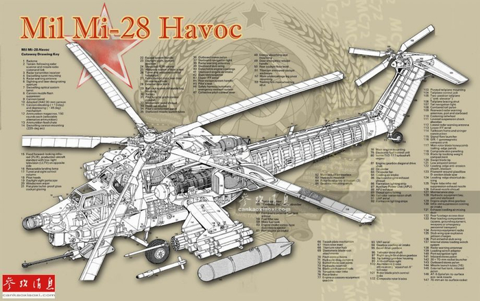 米-28N攻击直升机全长17.9米,旋翼直径17.2米,全高3.8米,最大起飞重量11.5吨。最大飞行速度每小时324千米,最大作战半径200千米。座舱布局沿用了传统的纵列双座设计。固定武器包括一门30毫米2A42机关炮(与BMP-2步兵战车主武器相同),备弹250发;4个翼下挂点可挂16枚反坦克导弹、2个20联装火箭巢或R-73空空导弹或地雷布撒器。图为米-28剖面图。