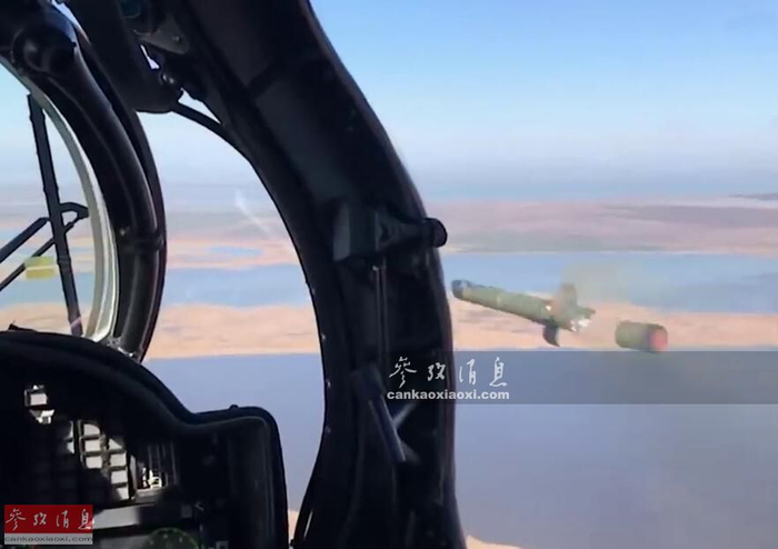 其中“产品-305”反坦克导弹采用激光制导(俄军宣传资料如此,但应是采用前沿激光照射辅助瞄准,或是其他复合制导方式),据俄罗斯连塔网2019年3月相关报道,其最大射程可达25公里,可从敌军野战防空火力外发动攻击,理论上一架米-28NM武直单次出击就能消灭一个坦克连(含12辆坦克)。图为俄军武直试射AT-15反坦克导弹瞬间。