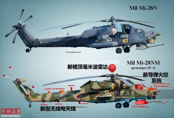 米-28NM是米-28N武直的“深度改进型”,相关项目于2009年就已启动,最大的外形识别特征是去除了机鼻天线罩,加装了与新型导弹匹配的火控系统。航电则换装了新型桅顶毫米波雷达系统,可在借助地形地貌掩护,不暴露全机的情况下,只伸出雷达探测敌军。图为米-28N与米-28NM改进对比示意图。
