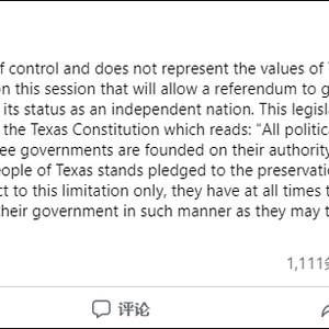 (观察者网讯)“联邦政府已经失控,不再代表得州人的价值观。”