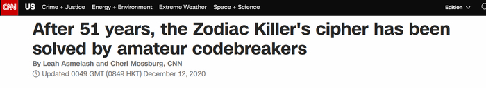 十二宫杀手(Zodiac killer)是一名于上世纪60年代晚期在美国加州北部犯下多起凶案的连环杀人犯。凶手作案手段极其残忍,且逍遥法外,不断向警方和媒体发送密码信件,并在信中宣称自己杀害了37人。但根据调查结果显示他仅杀害了7人,其中2人生还。《国会山报》称,虽然4个密码中已有3个被破解,但其在1969年发给《旧金山纪事报》的“340密码”(340 cipher)几十年来一直困扰着侦探和密码学家,等待破解。