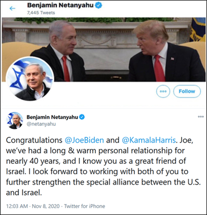 “巧合”的是,12月14日这天正好是美国大选的选举人团投票日,也就是大选结果被正式确认的日子。考虑到本次大选的当选总统是特朗普的“老冤家”拜登,内塔尼亚胡在这天“换封面”的举动,就显得内涵十足了。