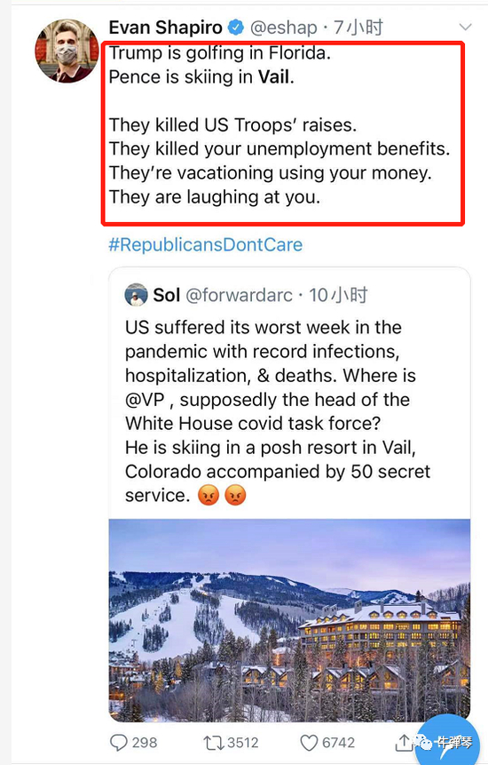 美国正在遭受疫情以来最糟糕的一周,创纪录的确诊、入院、死亡。副总统在哪里?他被认为是白宫抗疫总指挥,他却在50名特勤士兵保护下,在科罗拉多州范尔度假村滑雪……