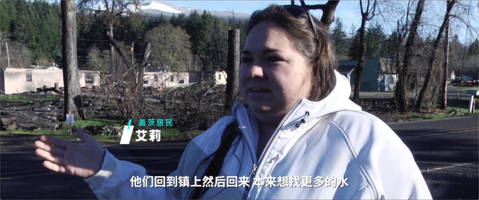 当地居民 艾利:马路对面的邻居在撤离后房子都在,他们曾试图保护财产。虽然山火过来了,但房子都幸存了下来。然后他们回到镇上,本来想找更多的水,结果发现他们的房子也烧毁了。另一边的业主我不知道,但这个人住在离莫黑玛镇(Mehama)不远的拖车里。他们希望等一切清理干净了,就把拖车带过来开始重建。