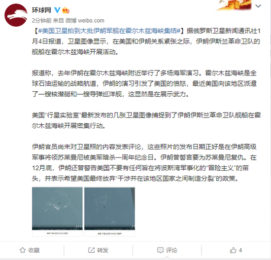 据俄罗斯卫星新闻通讯社1月4日报道,卫星图像显示,在美国和伊朗关系紧张之际,伊朗伊斯兰革命卫队的舰船在霍尔木兹海峡开展活动。