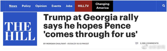 特朗普此行是为共和党人大卫•珀杜和凯利•勒弗勒助选,而有关选举将决定共和党是否保留对美国参议院的控制权。美国《国会山报》最新报道称,公开演讲中,特朗普再次谈及推翻大选结果话题,并表示希望现任副总统彭斯伸出援手,他暗示彭斯6日在监督选举人票计票认证过程中发挥“作用”。