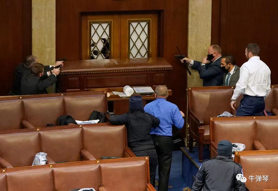 反正,刚看到上面这张照片,还以为是电影里的截图:国会大厦里,议员们已被紧急撤离,神情紧张的警卫们用枪抵住大门,大门玻璃已被砸碎……