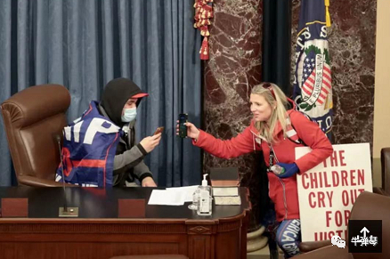 3,抗议者冲进国会,很多人也不戴口罩,一些人还特意坐到彭斯刚才的座位上,感受一下副总统身体的余温。