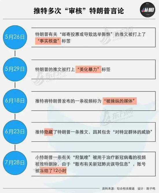 行政令签署的几天前,特朗普多条关于“弗洛伊德之死“的推文被推特标注为“涉嫌美化暴力”。此前的几个月,特朗普发布的部分有关新冠疫情防控的推文,也被推特贴上了“事实有待核查“等标签,并提醒用户“该言论具有误导性”。