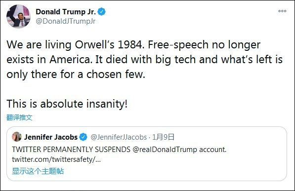 “我们生活在奥威尔的《1984》里。言论自由在美国已不复存在。它随着大型科技公司一起消亡了,只剩下选定的少数人,”小特朗普在推特上写道。“这简直是疯了!”