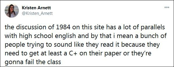 针对推特上关于《1984》的讨论,一名网友讽刺说,很多人可能根本没有读过这本书。“这个网站上关于《1984》的讨论和高中英语有很多相似之处,我的意思是很多人试图让自己听起来像是读过它,因为他们的论文至少得达到C+,否则他们这门课就会不及格。”