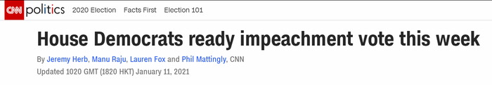 [环球时报-环球网报道 记者 白云怡 李司坤]美国众议院民主党议员周一表示,他们计划于周三举行弹劾投票,针对特朗普煽动支持者冲击国会大厦的指控进行表决。这是特朗普在任期内第二次遭到弹劾。此次弹劾究竟是否能成功?此次更非同寻常的情况在于,特朗普在白宫的时间已经所剩无几,美国制度到底是否允许在一位总统离任后再被罢免?日程会如何推进?这是美国政治、社会和法律此前都很少考虑过的问题。
