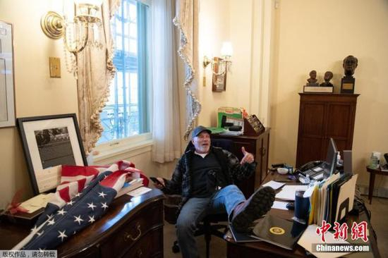 当地时间1月6日,美国参众两院确认选举人团投票结果的联席会议,因现任总统特朗普支持者闯入国会大厦引发大规模骚乱而被迫中断,现场极度混乱。图为特朗普支持者坐在美国众议院议长佩洛西办公室内。