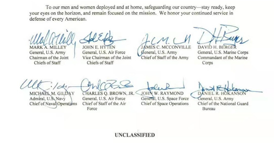 美国参谋长联席会议主席马克·米利已经召集所有参谋长联席会议成员,签署了一份声明。该份声明谴责了特朗普支持示威者的行为,并明确表示支持当选总统拜登——“当选总统拜登将就职,将成为我国第46任三军统帅”。在这份声明中,他们将1月6日 “勤王军”冲击国会之事定性为“骚乱”,认为是在冲击美国的宪法根基,是违背美国传统,违背美军的价值观和誓言的。