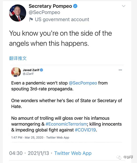看了一下,相比蓬佩奥的勤奋发推,扎里夫这次还没反应。国际舆论斗争激烈,蓬佩奥又在搞事了,中国还常常深夜批驳,扎里夫外长,你真不能偷懒啊。
