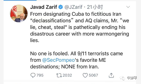 3,骂人要骂得有水平,还要有关键事实。扎里夫就一剑封喉:911是“基地”组织发动的,所有人来自哪儿?不是伊朗,而是你蓬佩奥喜欢的地方。