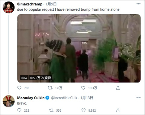 两天后(11日),又有一名特朗普的反对者发推提议,通过数字手段用现在40岁版本的卡尔金形象取代原片中的特朗普。卡尔金也回复了这条推文,表示“同意”。