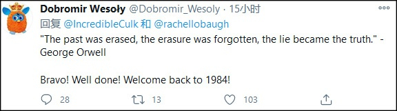 “乔治·奥威尔说,‘过去被抹去,抹去本身也被遗忘,谎言就成了真相’。精彩,你们干得太棒了!欢迎来到1984。”