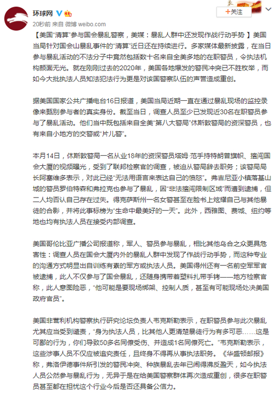原标题:美国“清算”参与国会暴乱警察,美媒:暴乱人群中还发现作战行动手势
