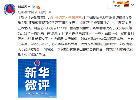 原标题:新华社评郑爽事件:让失德艺人彻底凉凉