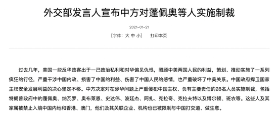就在21日凌晨,中国外交部宣布,对在涉华问题上严重侵犯中国主权、负有主要责任的28名人员实施制裁。