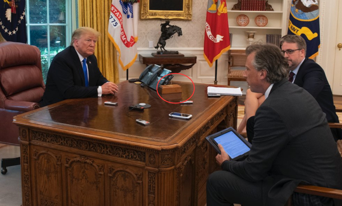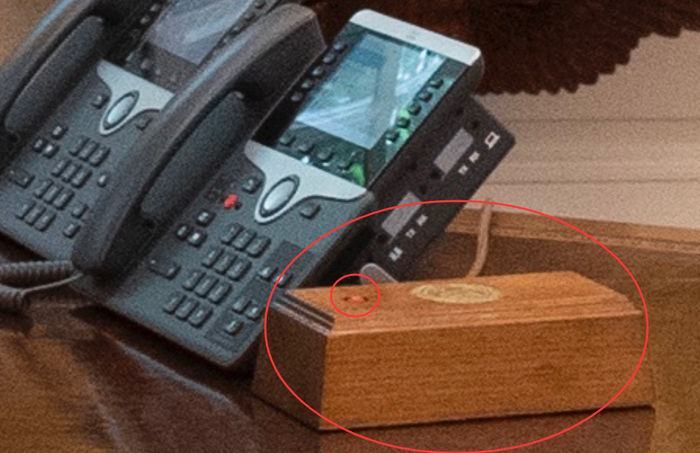 如下图所示,如今引起美国网民围观的,就是这个曾摆在特朗普白宫办公桌上的小红按钮。