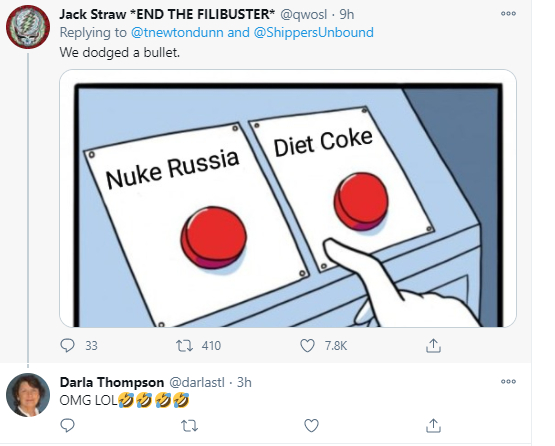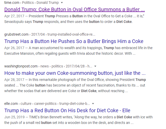 可由于美国主流媒体中有很多人非常讨厌特朗普,再加上特朗普又十分喜欢喝健怡可乐,就连亲特朗普的美国福克斯新闻网都确认过这一事实,结果这个按钮当时便被主流媒体传成了是特朗普的“健怡可乐按钮”(如下图所示),以贴合这些媒体给特朗普塑造的“巨婴”形象。特朗普也因此遭到了大量的调侃和嘲笑。