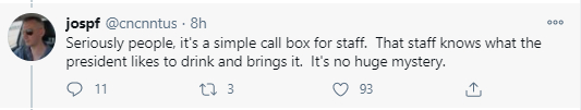 此人还表示这就是一个简单的呼叫职员的按钮,只是因为这些职员知道特朗普需要什么,所以才会给他提供相应的饮品,事情并没有那么复杂。