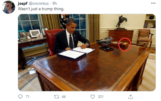不过,特朗普的支持者们也很快跳出来,为他们的偶像辩护。一名特朗普的支持者就称这个按钮并不是特朗普专有的,前总统奥巴马和布什桌上都有过这个按钮: